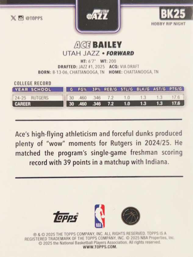 You are purchasing a 2025 Topps Rip Night Ace Bailey #BK25 RC. You will receive the exact item in the photographs. Thank you for looking.