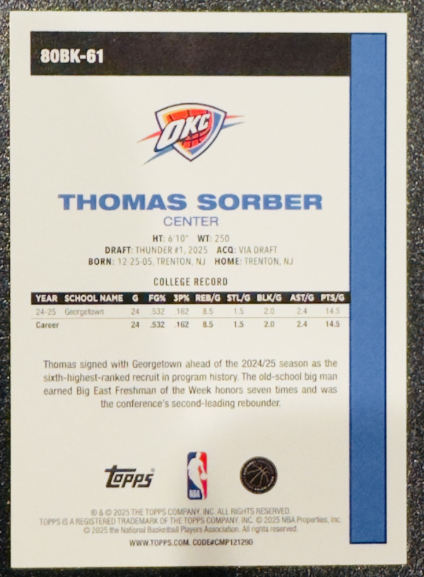 You are purchasing a 2025 Topps Thomas Sorber #80BK-61 - Oklahoma City Thunder RC. You will receive the exact item in the photographs. Thank you for looking.