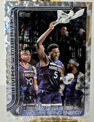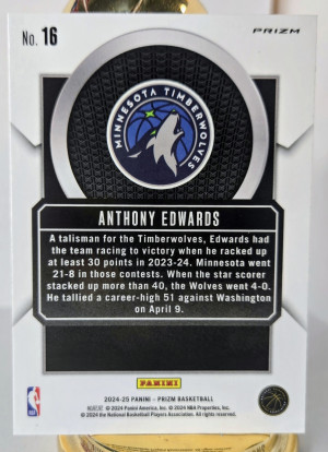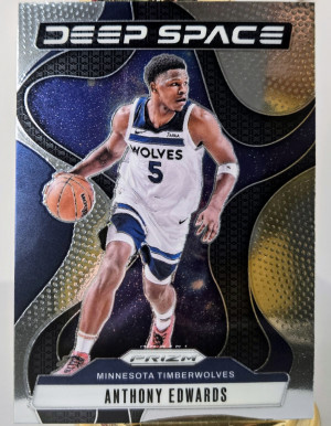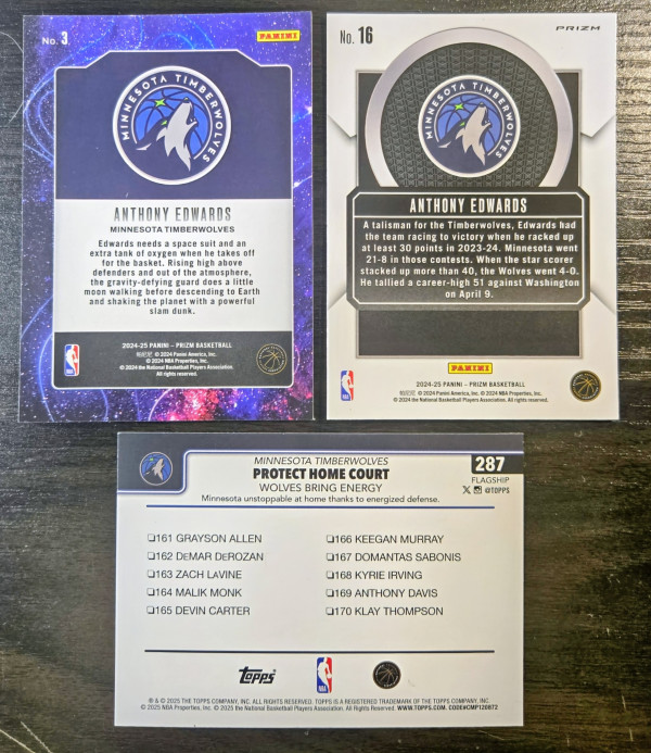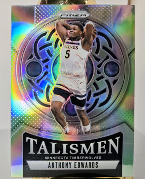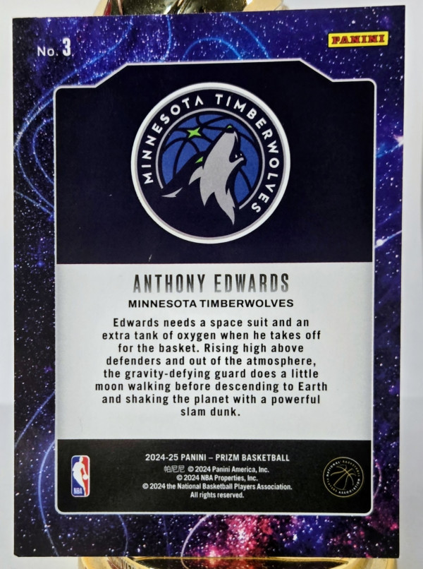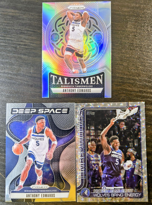 The product is a set of three sports trading cards featuring basketball player Anthony Edwards from the Minnesota Timberwolves. These cards include a '24-25 Talisman Prizm, Deep Space, & 2025 Topps Diamante design by Panini, with features like Parallel and Insert elements. These cards are part of the National Basketball Association (NBA) league and are from the 2024-25 season, making them a valuable addition to any sports trading card collection.