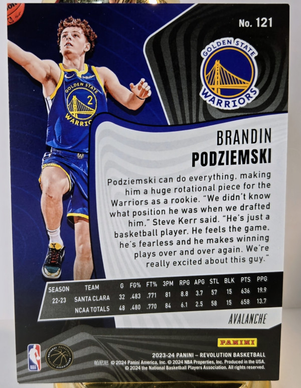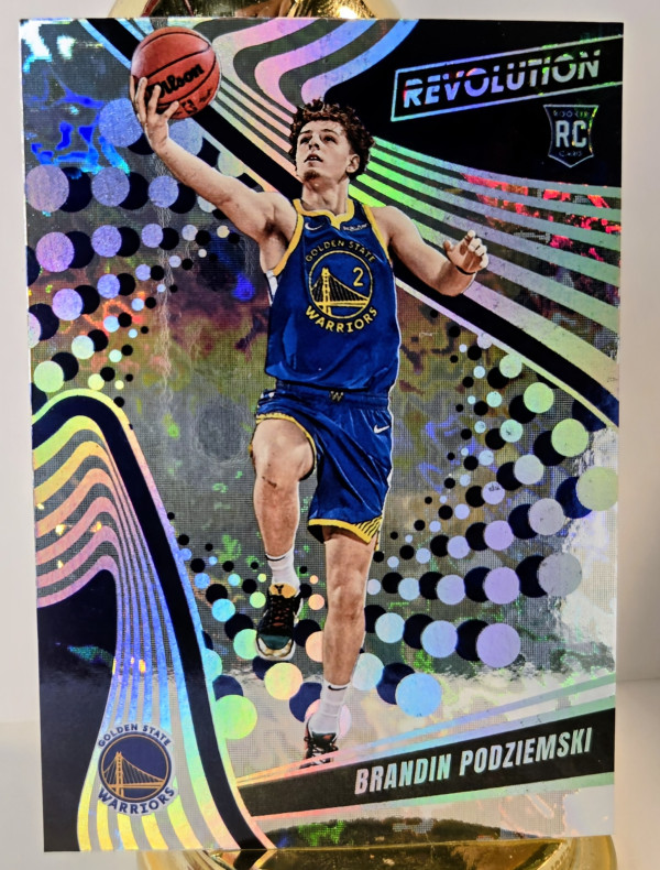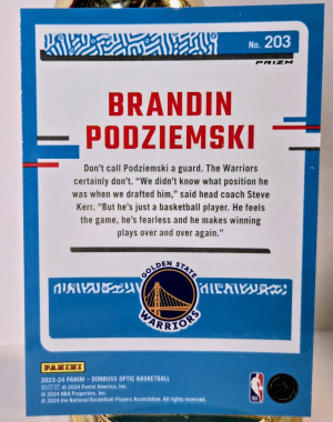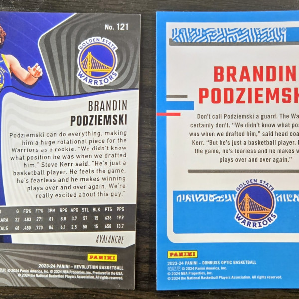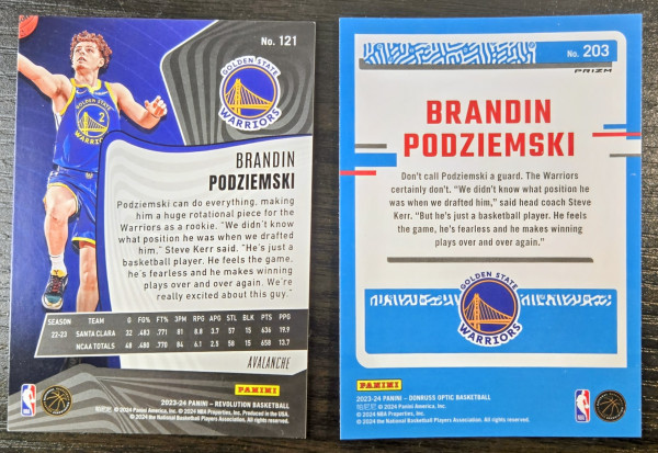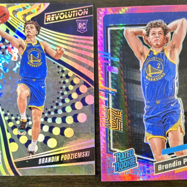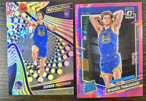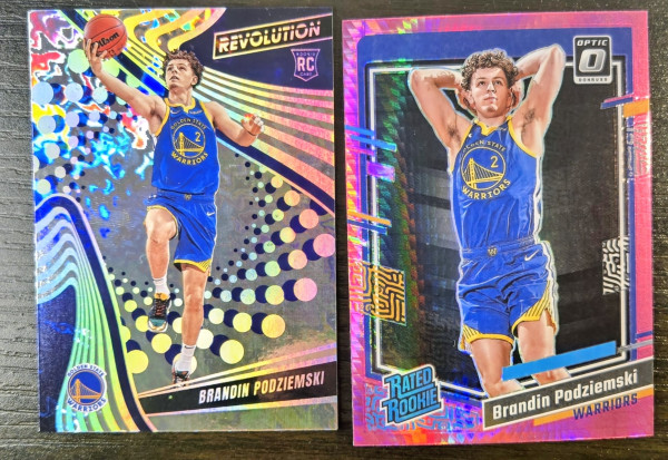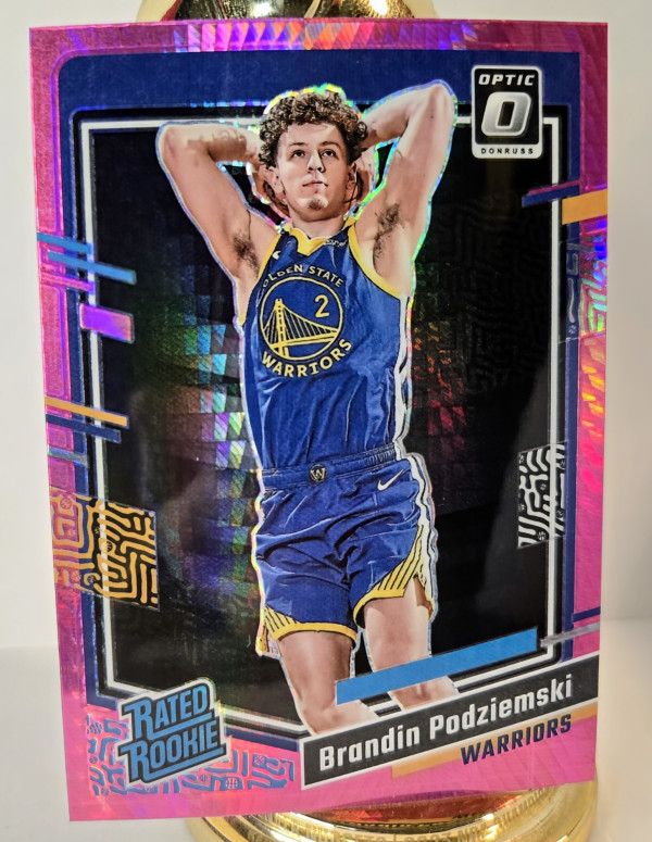 The product is a pair of basketball trading cards featuring Brandin Podziemski, a rookie player for the Golden State Warriors in the NBA. The cards are part of the 2023-24 Panini Donruss Optic set, specifically the Pink Hyper Prizm parallel and the Revolution Avalanche subset. These collectible cards are sought after by fans and collectors looking to add unique and rare pieces to their sports trading card collection.