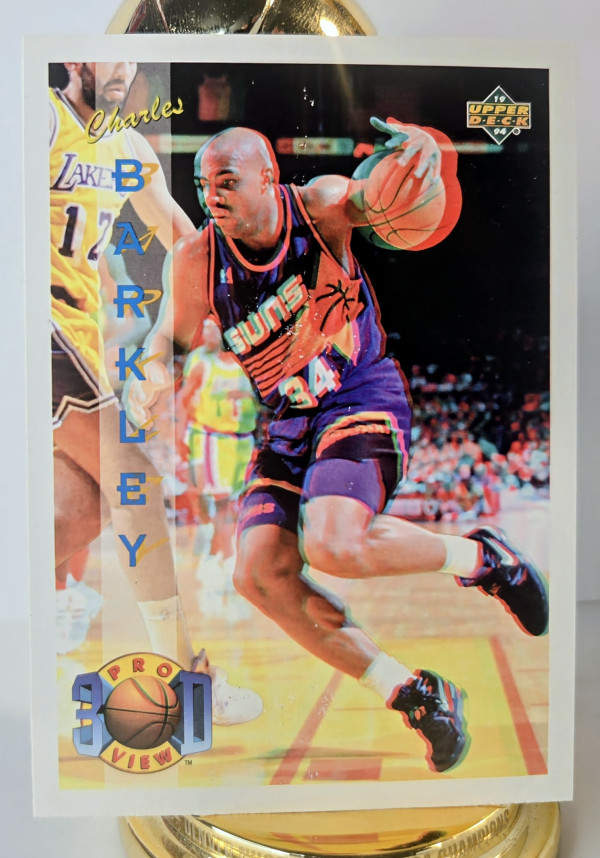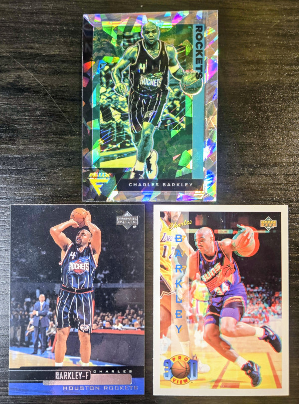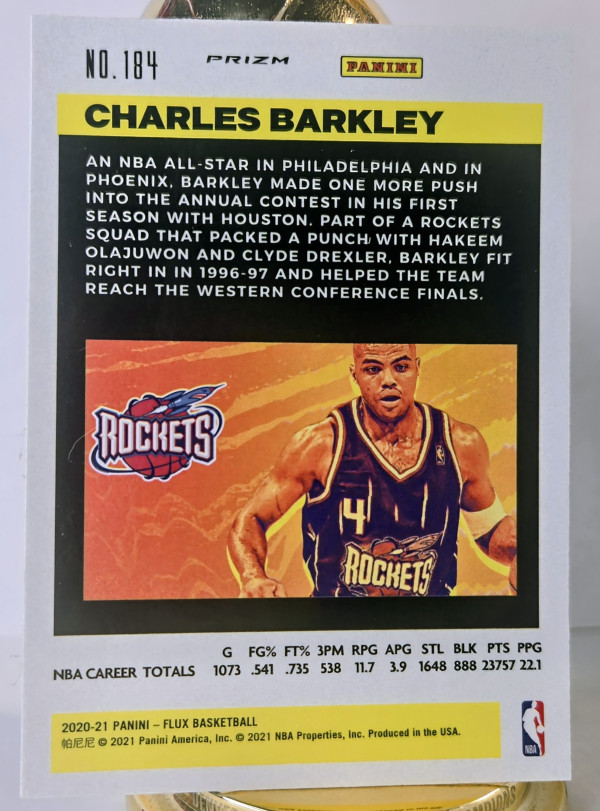 The product is a lot of three basketball trading cards featuring Charles Barkley from the 2020-21 Panini Flux set. The cards are '20-21 Flux Fanatics Cracked Ice, '93 Pro View 3D, and '99 UD. These sports trading cards are manufactured by Panini and belong to the National Basketball Association (NBA) league. The cards are part of the Houston Rockets and Phoenix Suns teams and have card numbers 184, making them a desirable addition for collectors of basketball memorabilia.
