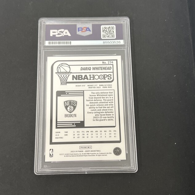 This listing features a 2023-2024 Panini NBA Hoops #274 Dariq Whitehead, professionally PSA authenticated.