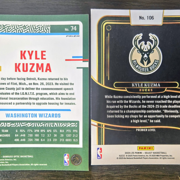 The product is a set of two basketball trading cards featuring NBA player Kyle Kuzma. The cards are from different manufacturers, one from Donruss (Optic Hyper Pink) and the other from Select (Premier Level). These cards are part of parallel sets and belong to the '23-24 and '24-25 seasons. The player is associated with the Washington Wizards and Milwaukee Bucks. These collectible cards are ideal for fans of basketball trading cards looking to add unique and exclusive cards to their collection.