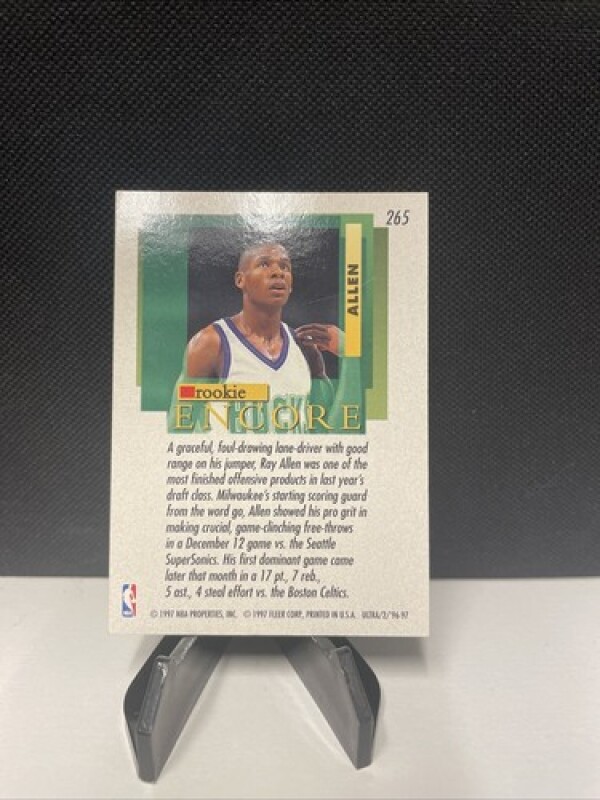 This sports trading card features Ray Allen, a former basketball player for the Milwaukee Bucks. It is a 1996 Fleer Ultra Rookie Encore #265, made of card stock material and part of the base set. The card is an original and not a licensed reprint, manufactured in the United States in 1996.