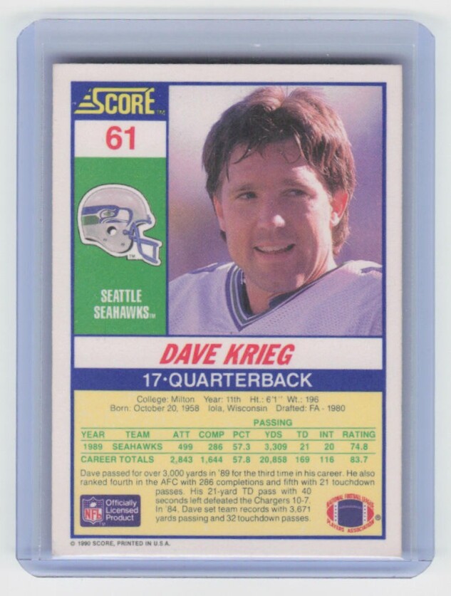 You are purchasing a 1990 Score 100 Hottest Dave Krieg #16. You will receive the exact item in the photographs. Thank you for looking.