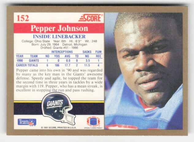 You are purchasing a 1991 Score Pepper Johnson #152. You will receive the exact item in the photographs. Thank you for looking.