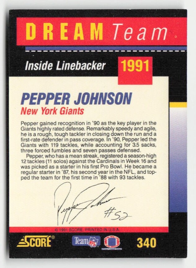 You are purchasing a 1991 Score Pepper Johnson #340. You will receive the exact item in the photographs. Thank you for looking.