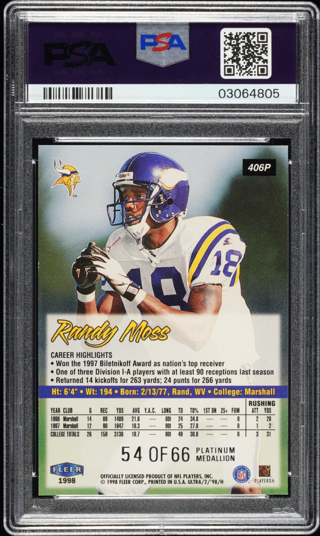 You are purchasing a 1998 Ultra Randy Moss #406P Platinum Medallion /66 PSA 9. You will receive the exact item in the photographs. Thank you for looking.
