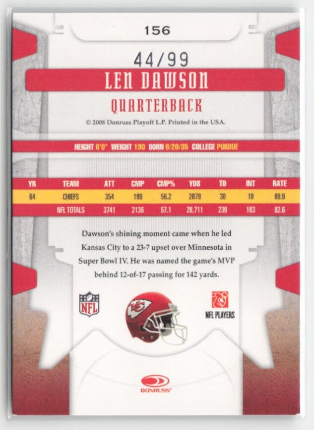 You are purchasing a 2008 Leaf Limited Len Dawson #156 Silver Spotlight 44/99 HOF SN SUPER COOL CARD. You will receive the exact item in the photographs. Thank you for looking.