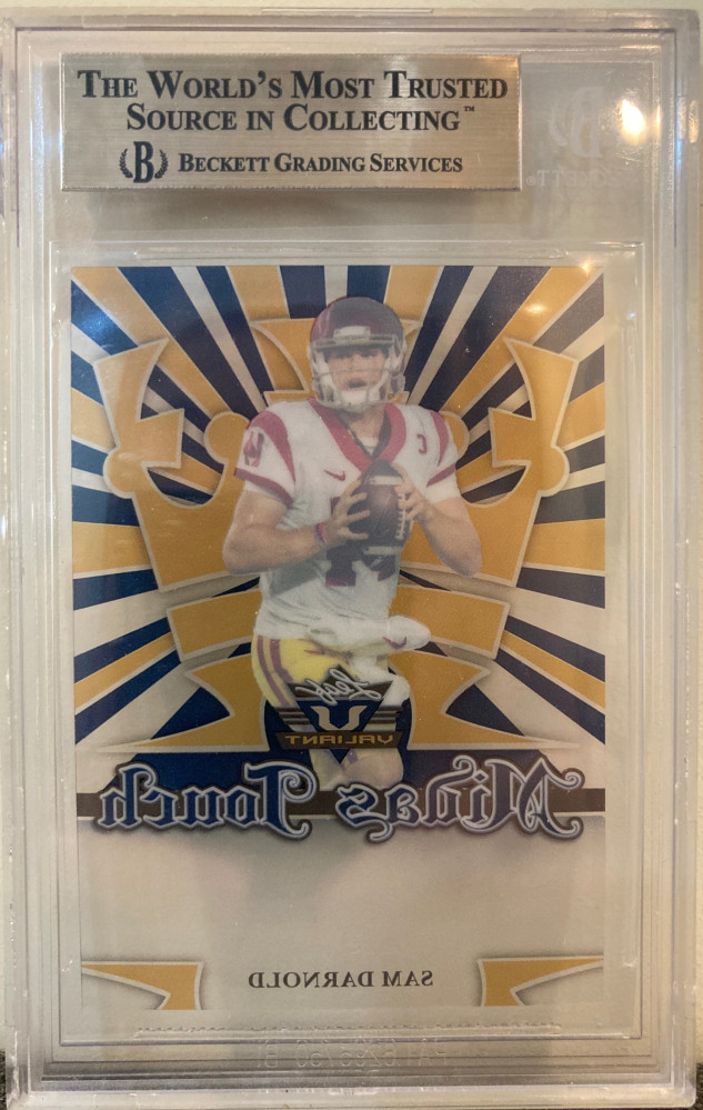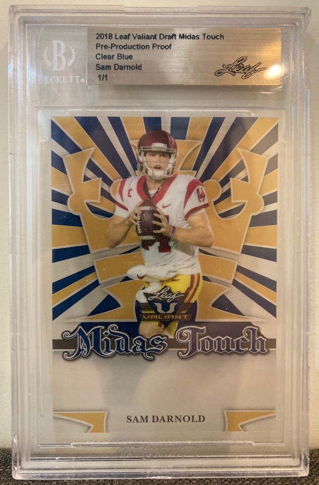 2018 Leaf Valiant Draft SAM DARNOLD Midas Touch Beckett Pre-Production Proof Clear Blue 1/1. Card was already sealed in Beckett slab prior to public sale. Slight chip on top corner.
