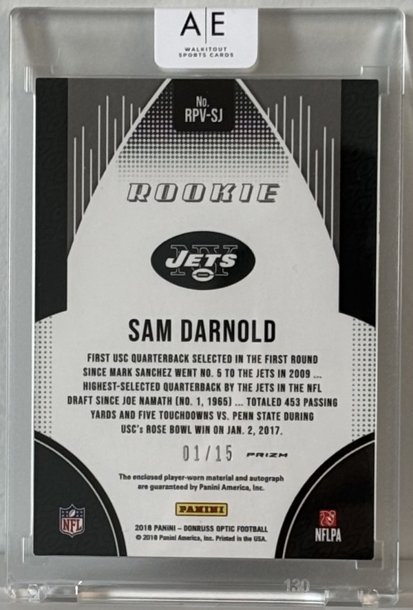 2018 Panini Optic 🏈🔥Sam Darnold RC Rookie Patch Auto #01/15 First! Jets Logo!