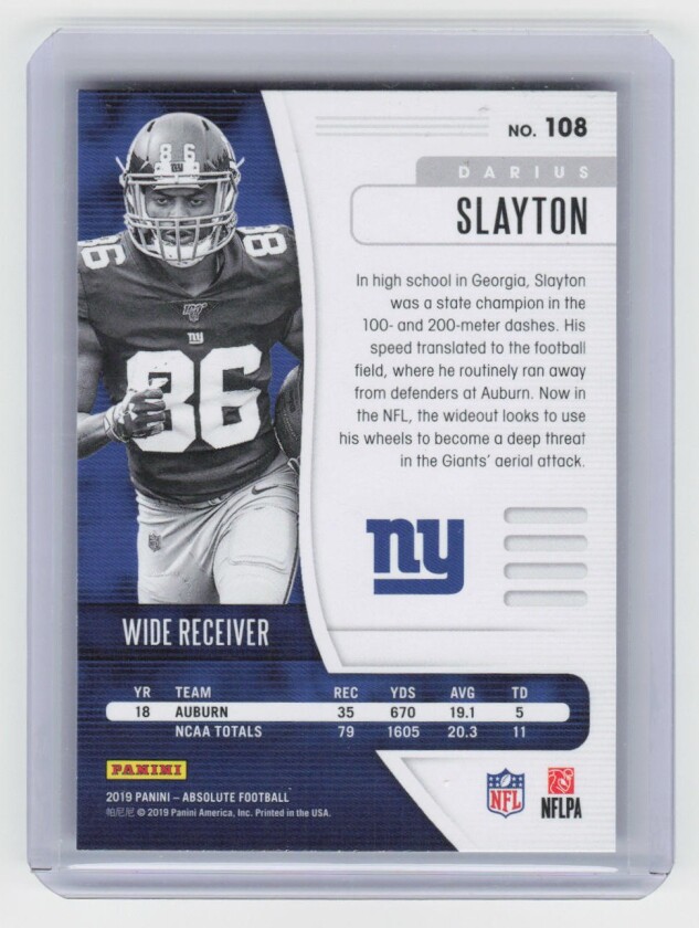 You are purchasing a 2019 Panini Absolute Darius Slayton #108 Retail RC. You will receive the exact item in the photographs. Thank you for looking.