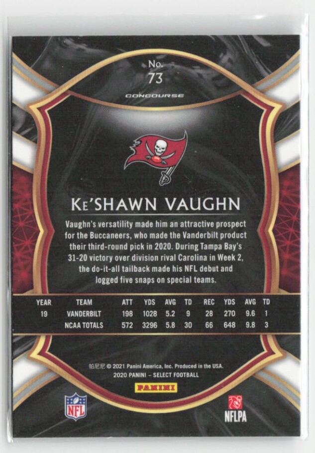 You are purchasing a 2020 Panini Select Ke'Shawn Vaughn #73 RC. You will receive the exact item in the photographs. Thank you for looking.