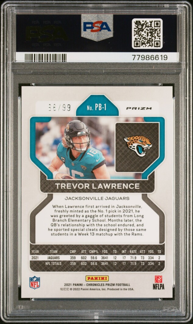 You are purchasing a 2021 Panini Chronicles Prizm Black Trevor Lawrence #PB-1 Red PSA 10. You will receive the exact item in the photographs. Thank you for looking.