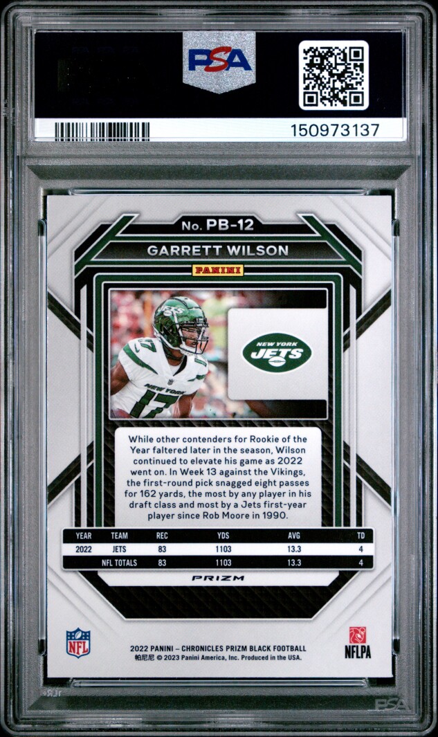 You are purchasing a 2022 Panini Chronicles Prizm Black Garrett Wilson #PB12 Silver PSA 10. You will receive the exact item in the photographs. Thank you for looking.