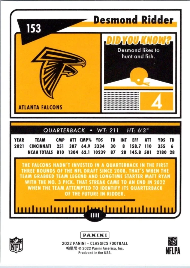 This is a nice example of a 2022 Panini Classics #153 Desmond Ridder