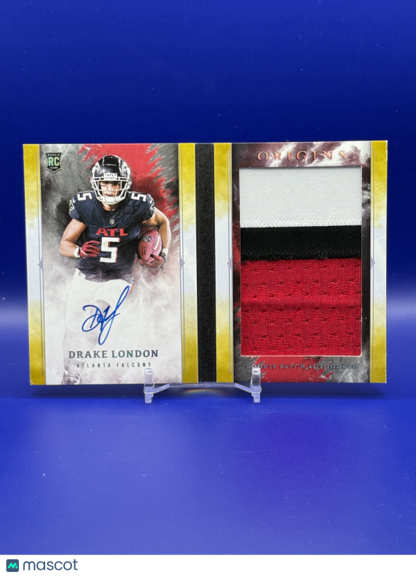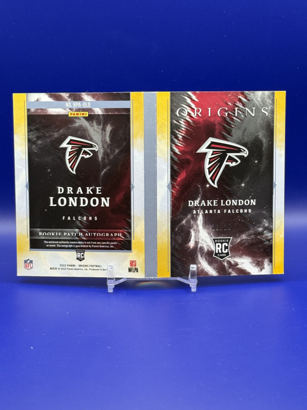 Add a standout card to your collection with this 2022 Panini Origins Drake London Rookie Patch Autograph Booklet, serial numbered out of just 25! This rare NFL collectible features an on-card autograph by Drake London, the dynamic wide receiver for the Atlanta Falcons, making it a must-have for any serious football or Falcons fan.
