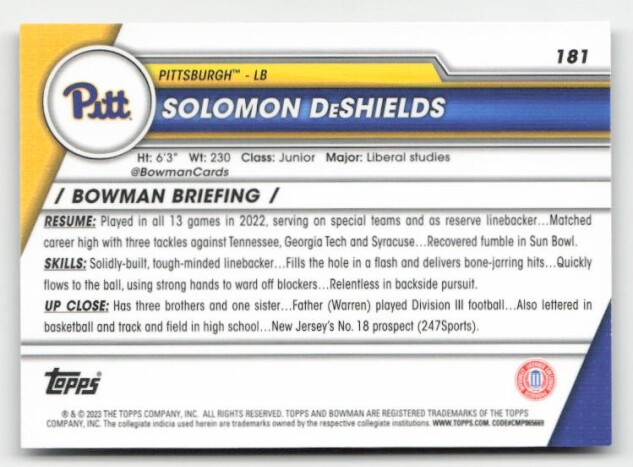 You are purchasing a 2023 Bowman University Chrome Solomon DeShields #181. You will receive the exact item in the photographs. Thank you for looking.