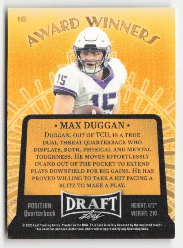You are purchasing a 2023 Leaf Draft Max Duggan #16 Red. You will receive the exact item in the photographs. Thank you for looking.