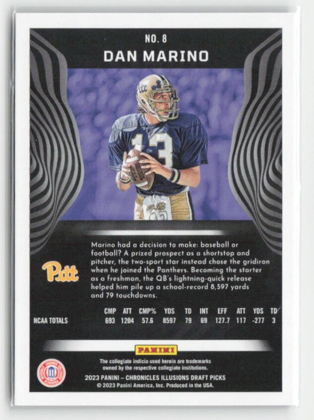 You are purchasing a 2023 Panini Chronicles Draft Picks Dan Marino #8 Illusions. You will receive the exact item in the photographs. Thank you for looking.