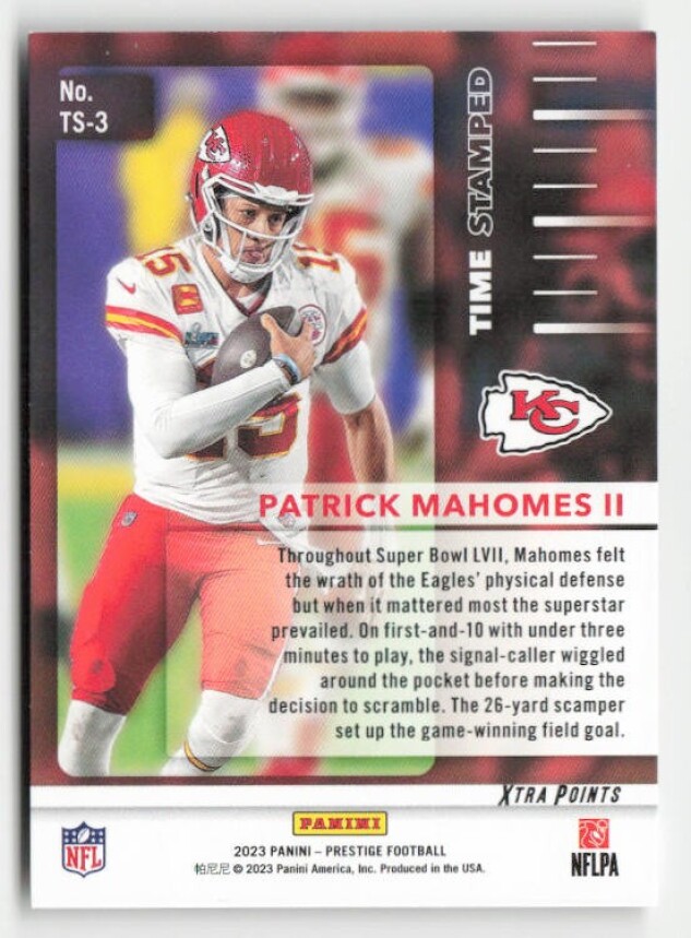 You are purchasing a 2023 Panini Prestige Patrick Mahomes II #TS-3 Time Stamped. You will receive the exact item in the photographs. Thank you for looking.