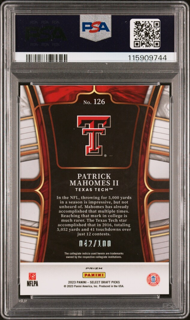 The 2023 Select Draft Picks Patrick Mahomes Black and Gold Squares Prizm /100 PSA 10 trading card is a rare and highly sought-after collectible for football fans. With only 100 copies in existence, this card features a Prizm parallel variety and is graded a perfect 10 by Professional Sports Authenticator (PSA). It showcases the talented quarterback Patrick Mahomes II from the Kansas City Chiefs, making it an invaluable addition to any sports trading card collection. The card is made of high-quality card stock and is sure to be a standout piece for any NFL enthusiast.