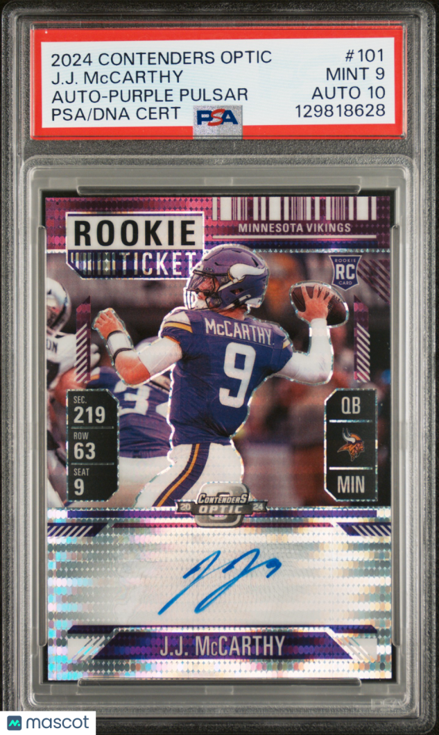 You are purchasing a 2024 Contenders Optic JJ Mccarthy Purple Pulsar Auto 11/27 #101 PSA 9 Auto 10. You will receive the exact item in the photographs. Thank you for looking.