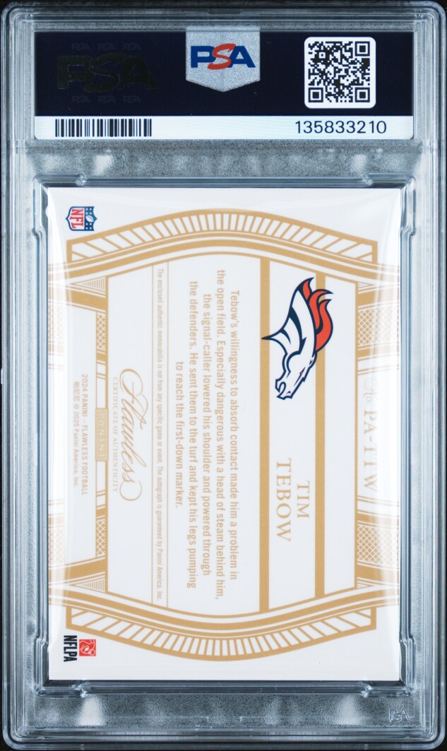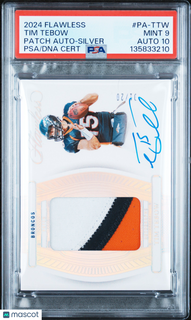 You are purchasing a 2024 Flawless Patch Autographs Tim Tebow Silver 02/10 #PA-TTW PSA 9 Auto 10. You will receive the exact item in the photographs. Thank you for looking.
