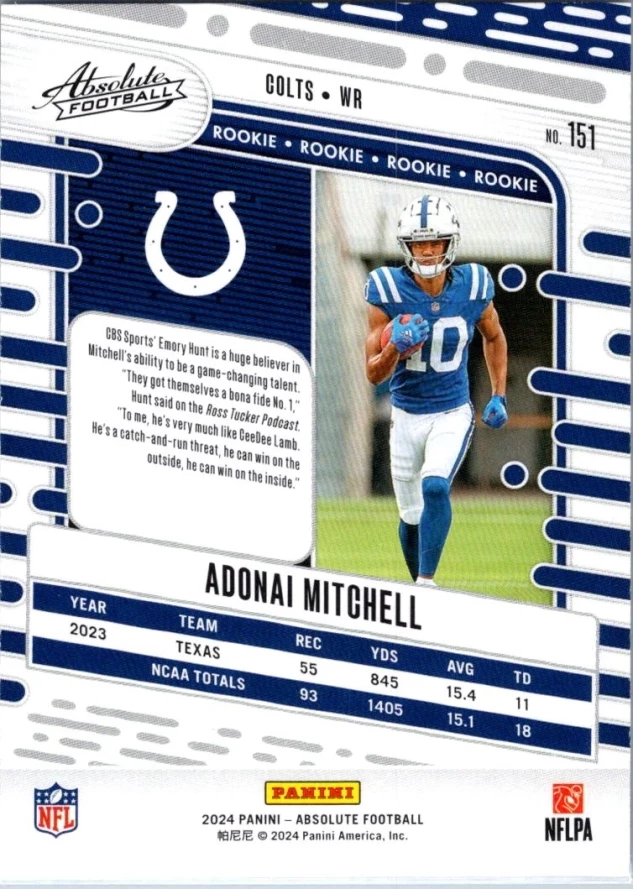 This is a nice example of a 2024 Panini Absolute #151 Adonai Mitchell Retail