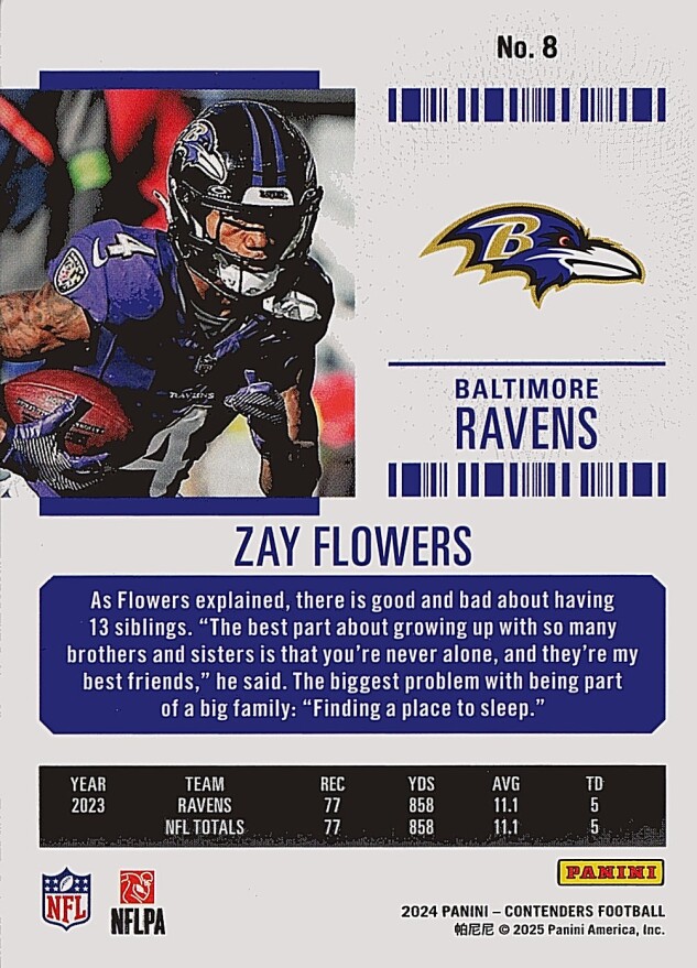 You are purchasing a 2024 Panini Contenders Zay Flowers #8 Retail. You will receive the exact item in the photographs. Thank you for looking.