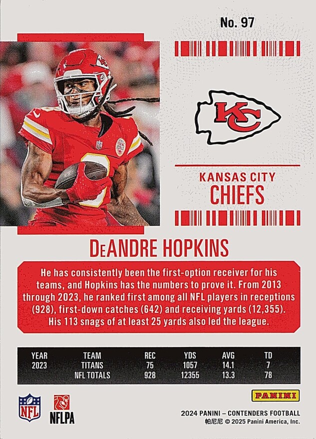 You are purchasing a 2024 Panini Contenders DeAndre Hopkins #97 Retail. You will receive the exact item in the photographs. Thank you for looking.