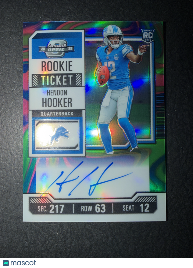 Don’t miss your chance to own this ultra-rare 2024 Panini Contenders Optic Prizm Neon Marble Rookie Card, hand-signed by Detroit Lions standout Hendon Hooker! This stunning short print, serial numbered 02/04, is a must-have for serious NFL collectors and fans looking to add a true gem to their collection.