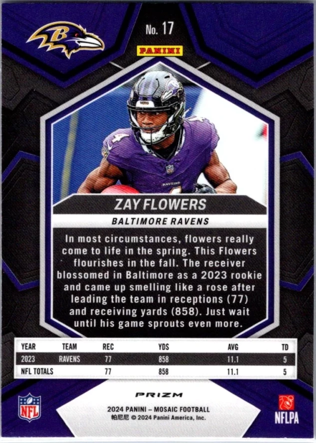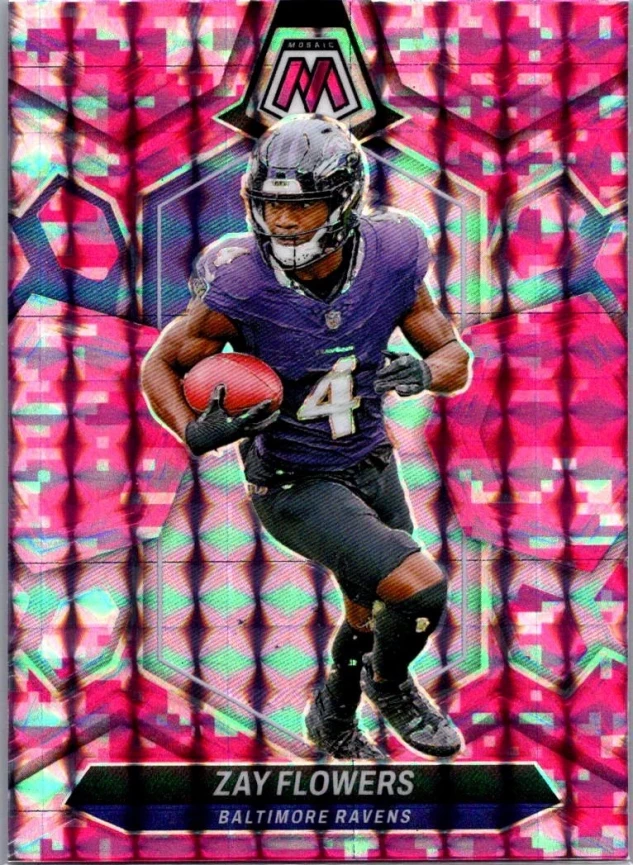 This is a nice example of a 2024 Panini Mosaic #17 Zay Flowers Mosaic Camo Pink