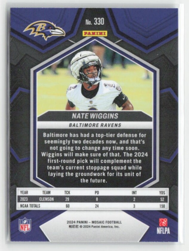 You are purchasing a 2024 Panini Mosaic Nate Wiggins #330 RC. You will receive the exact item in the photographs. Thank you for looking.