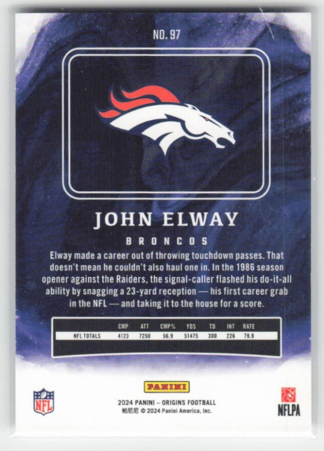 You are purchasing a 2024 Panini Origins John Elway #97. You will receive the exact item in the photographs. Thank you for looking.