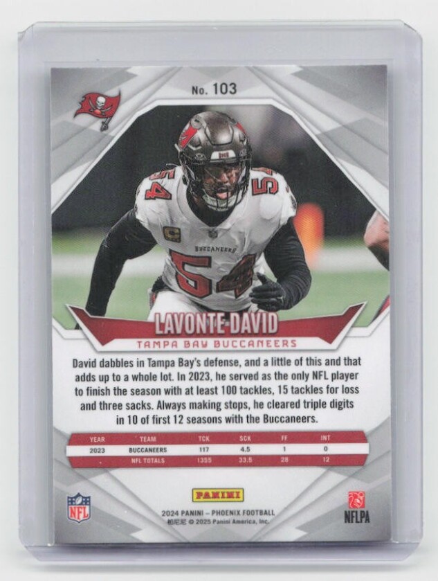 You are purchasing a 2024 Panini Phoenix Lavonte David #103 Silver. You will receive the exact item in the photographs. Thank you for looking.