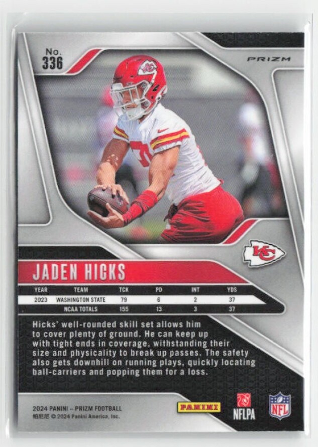You are purchasing a 2024 Panini Prizm Jaden Hicks #336 RC. You will receive the exact item in the photographs. Thank you for looking.