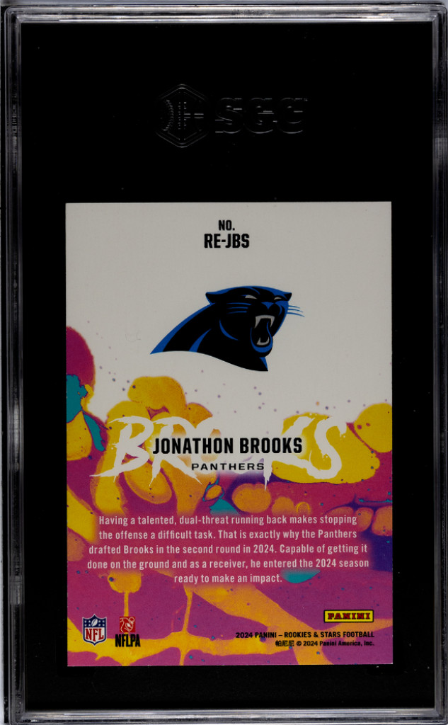 You are purchasing a 2024 Panini Rookies & Stars Jonathon Brooks #RE-JBS Exclusive Purple 01/35 Rookie Carolina Panthers SGC 9.5. You will receive the exact item in the photographs. Thank you for looking.