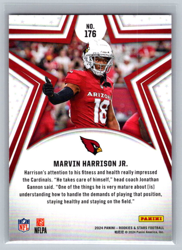 You are purchasing a 2024 Panini Rookies & Stars Marvin Harrison Jr. #176 RC Arizona Cardinals. You will receive the exact item in the photographs. Thank you for looking.