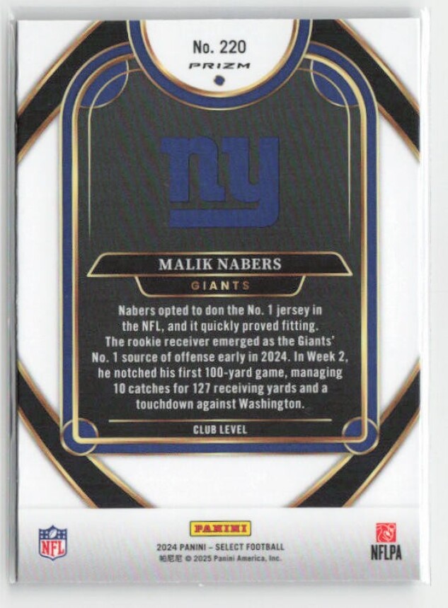 You are purchasing a 2024 Panini Select Malik Nabers #220 Red & Blue Prizm Shock RC. You will receive the exact item in the photographs. Thank you for looking.
