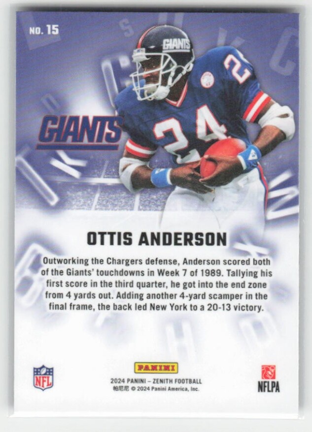 You are purchasing a 2024 Panini Zenith Ottis Anderson #15 A to Z. You will receive the exact item in the photographs. Thank you for looking.