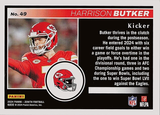 You are purchasing a 2024 Panini Zenith Harrison Butker #49 Retail. You will receive the exact item in the photographs. Thank you for looking.