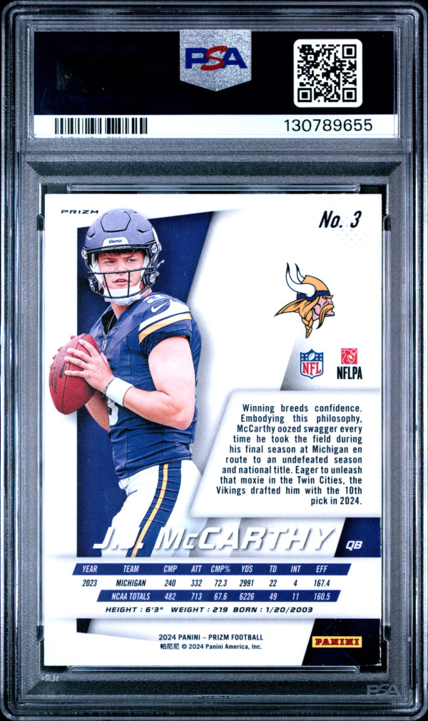 You are purchasing a 2024 Prizm JJ Mccarthy No Huddle Flashback RC #3 PSA 8. You will receive the exact item in the photographs. Thank you for looking.