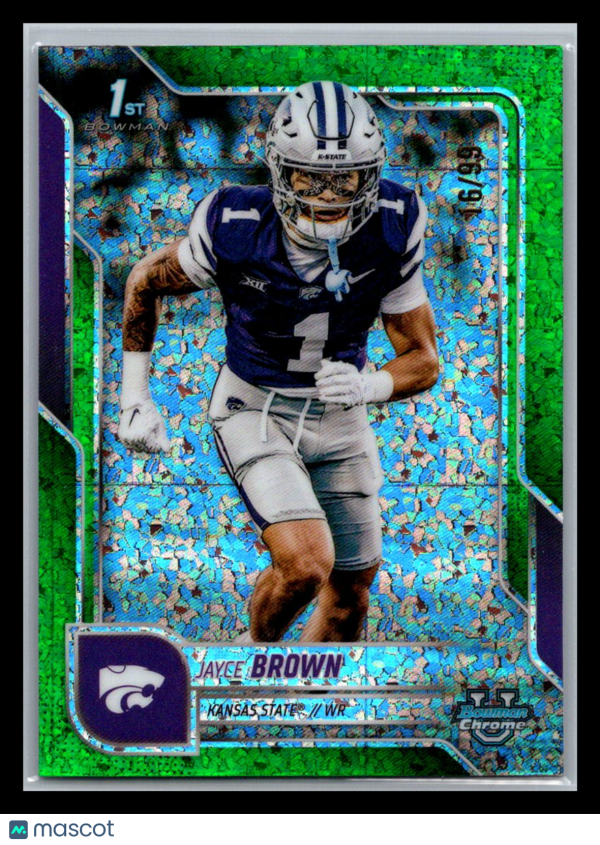 You are purchasing a 2025 Topps Bowman Chrome University Jayce Brown #71 Green Mini-Diamond Parallel/Variety 16/99 Kansas State Wildcats. You will receive the exact item in the photographs. Thank you for looking.