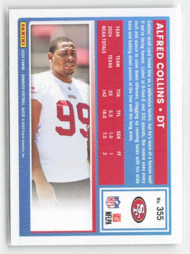 You are purchasing a 2025 Donruss Alfred Collins #355 RC. You will receive the exact item in the photographs. Thank you for looking.