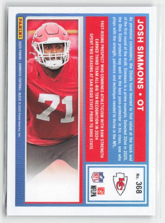 You are purchasing a 2025 Donruss Josh Simmons #368 RC. You will receive the exact item in the photographs. Thank you for looking.