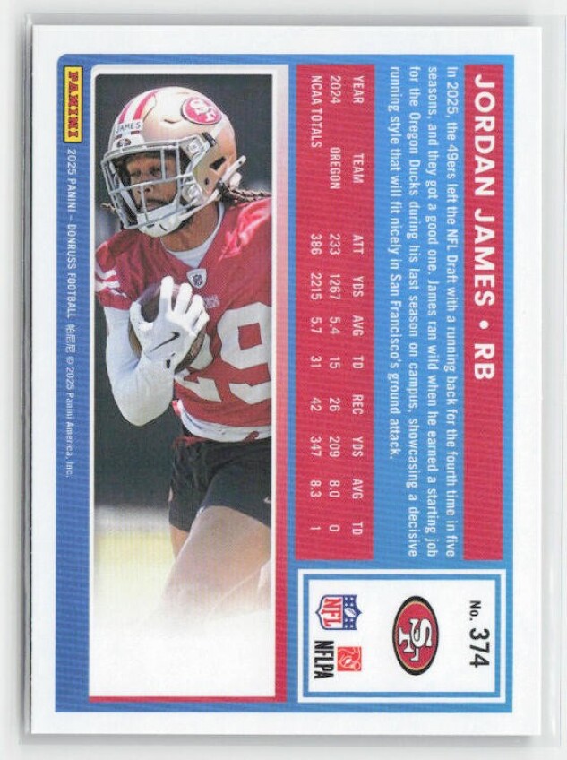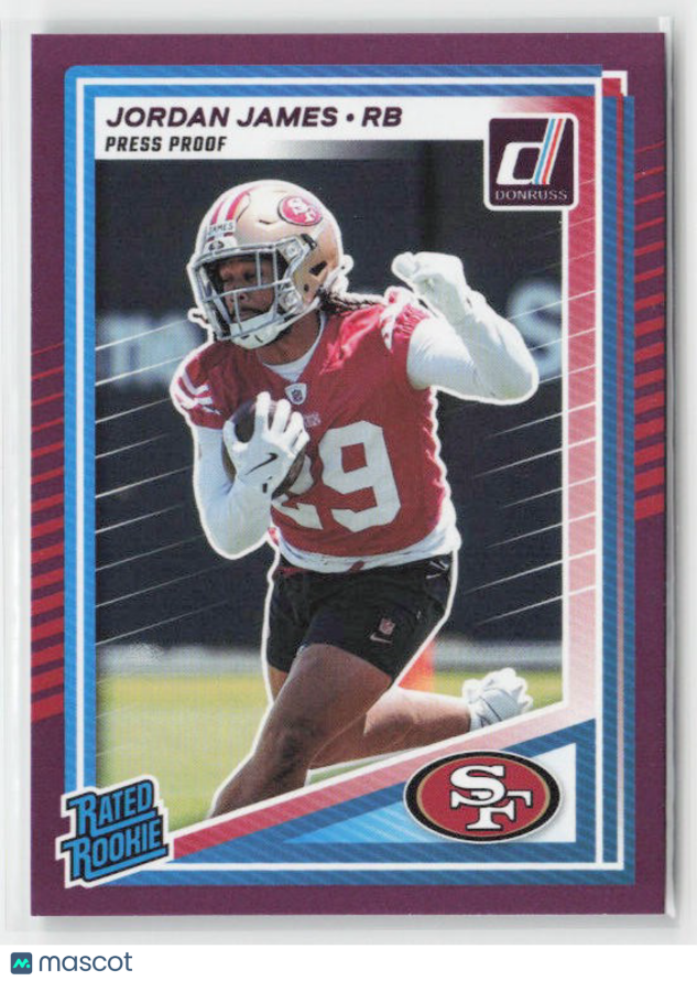 You are purchasing a 2025 Donruss Jordan James #374 Press Proofs Purple RC. You will receive the exact item in the photographs. Thank you for looking.