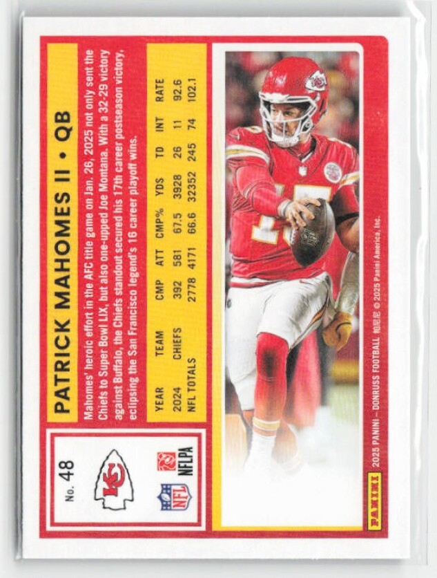 You are purchasing a 2025 Donruss Patrick Mahomes II #48 Press Proofs Purple. You will receive the exact item in the photographs. Thank you for looking.