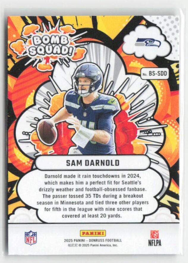 You are purchasing a 2025 Donruss Sam Darnold #BS-SDD Bomb Squad. You will receive the exact item in the photographs. Thank you for looking.