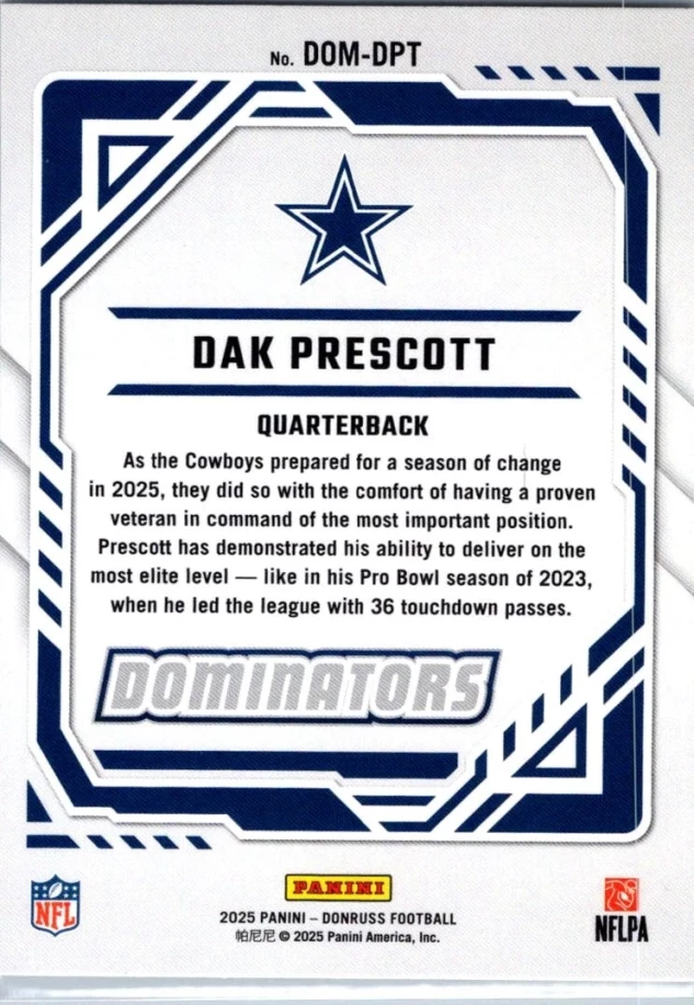 This is a nice example of a 2025 Donruss #DOM-DPT Dak Prescott Dominators
